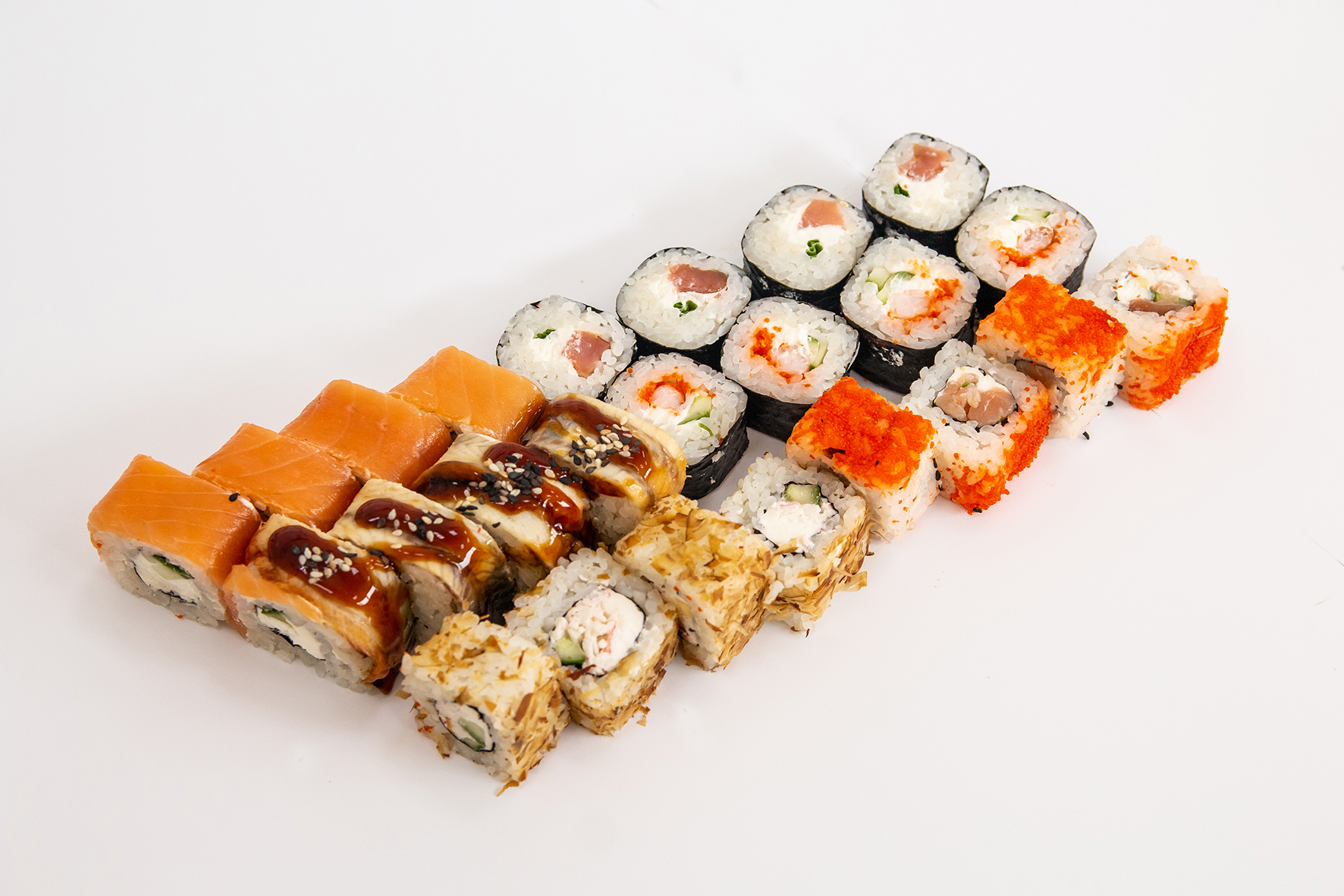 6 видов по 4шт ( 24 шт) Филадельфия, унаги филадельфия, Кани, Касима, Восходящее солнце, Небраска. К набору прилагается Соус соевый 20мл, имбирь 20 гр, васаби 10гр.