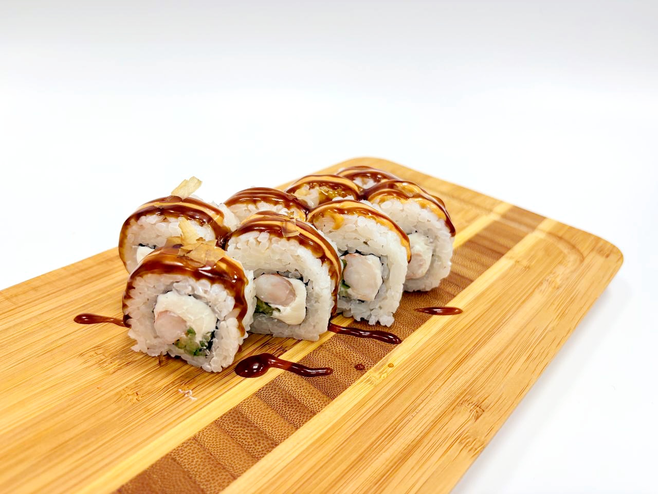 Оригинальный Ролл с сыром Креметте, Свежим огурцом и Тигровой кревткой. Украшен соусами ТОМ ЯМ и УНАГИ и Луком Фри