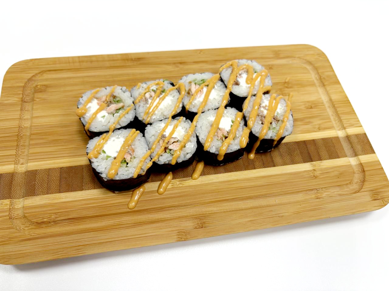 Классический ролл с сыром Креметте, Жаренным лососем, свежим огурецом. Украшен соусом ТОМ ЯМ